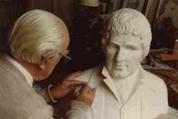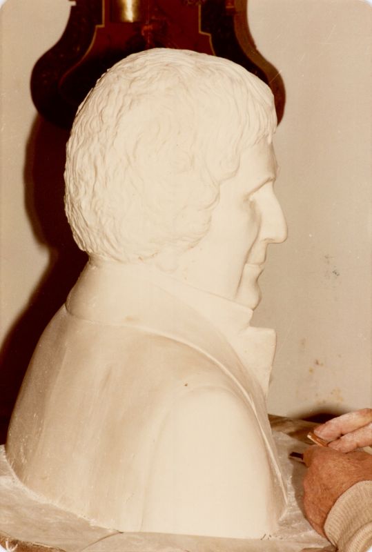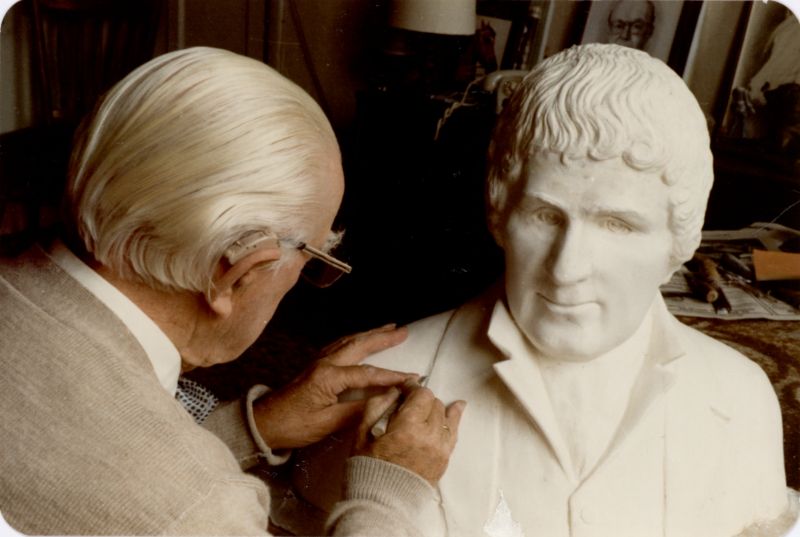 Gerhardus Jan Adema aan het werk met het borstbeeld van Eise Eisinga. Hij overle