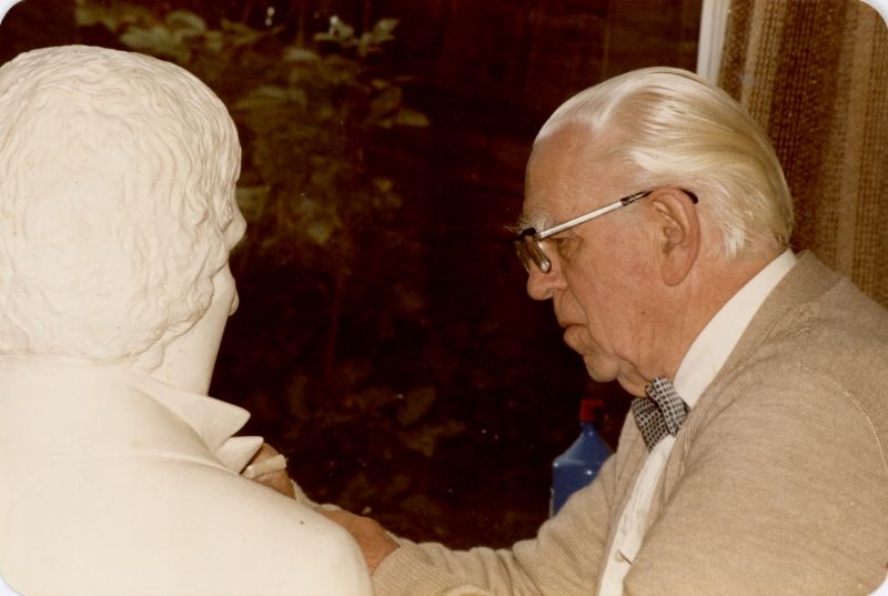 G. J. Adema met gipsbeeld Eise Eisinga, Tsjerkebuorren